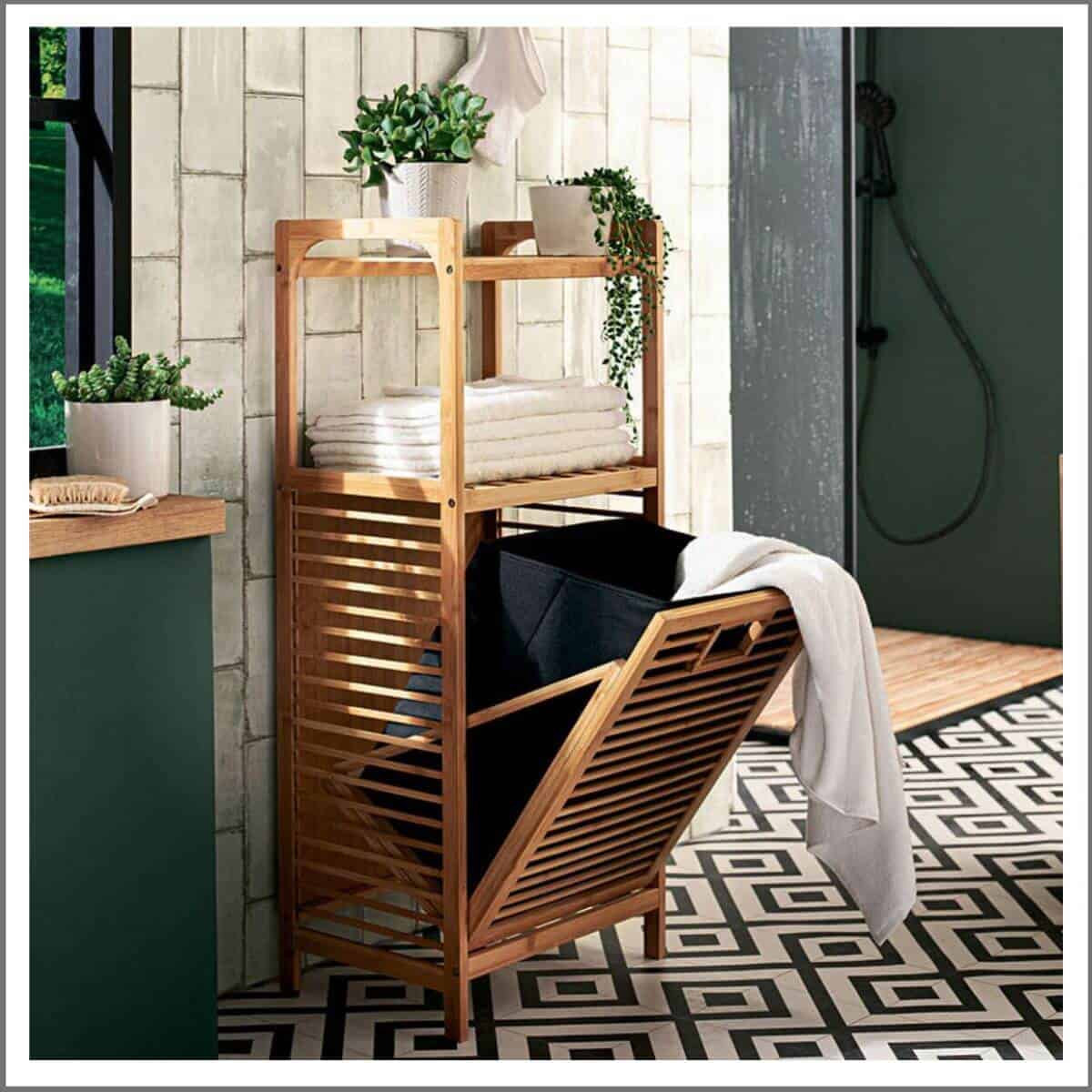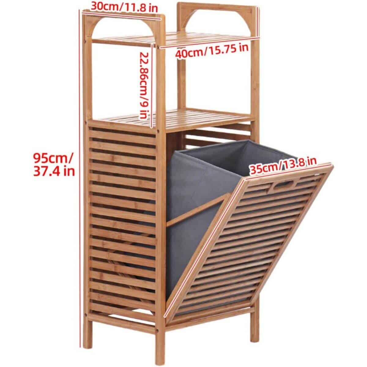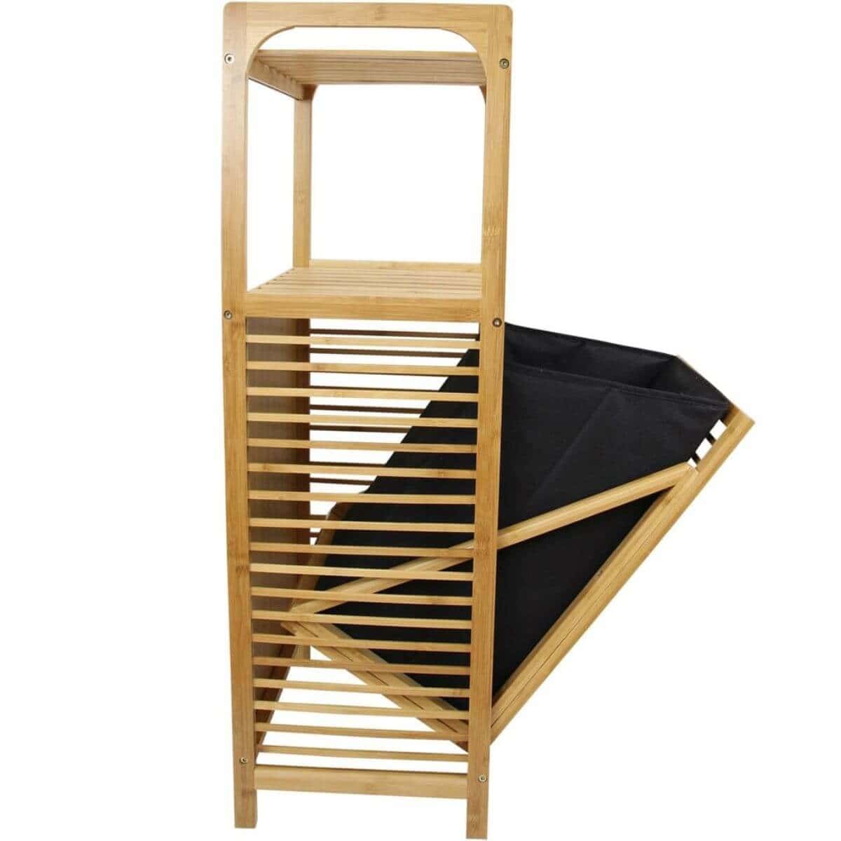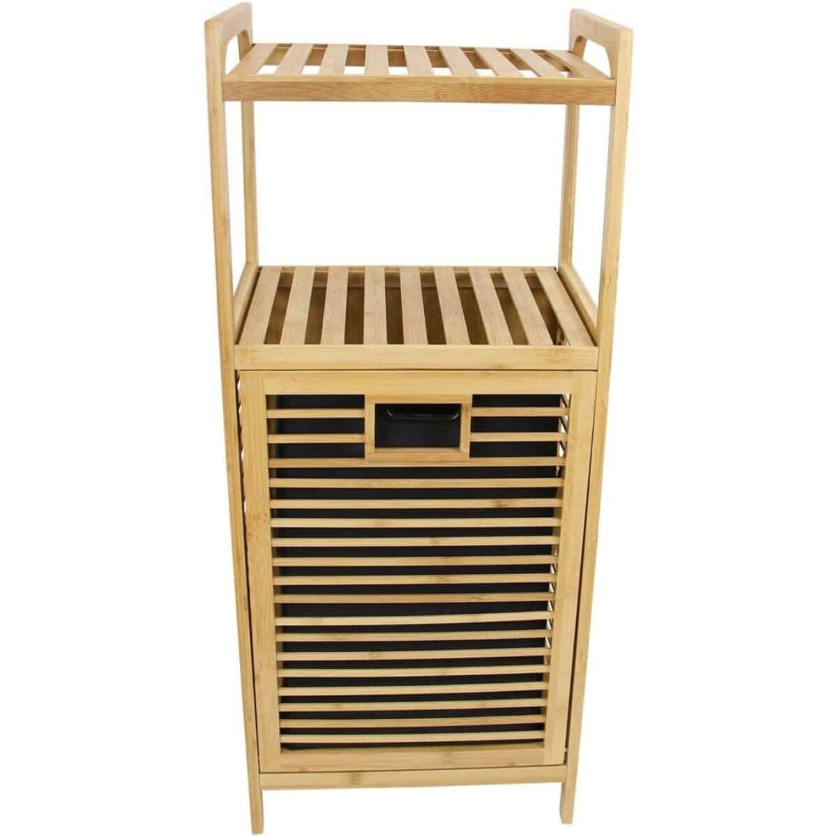 ארונית אחסון – שירות עשויה מעץ מלא במבוק הכוללת מדפים וסל כביסה